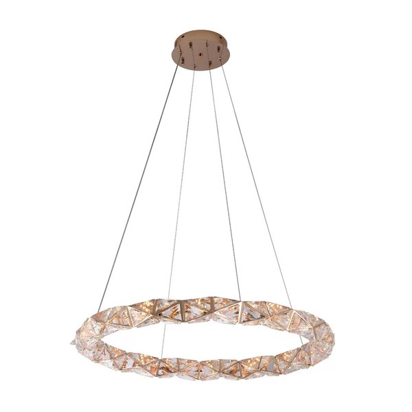 - Design contemporâneo com estrutura em alumínio, cristal e metal, acabamento ouro brilho e detalhes refinados.